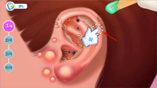 玩家进入游戏后,首先会进入新手关卡,该关卡的核心目的是引导玩家学习如何为病人清理耳朵上的脏污以及处理发炎的部位。