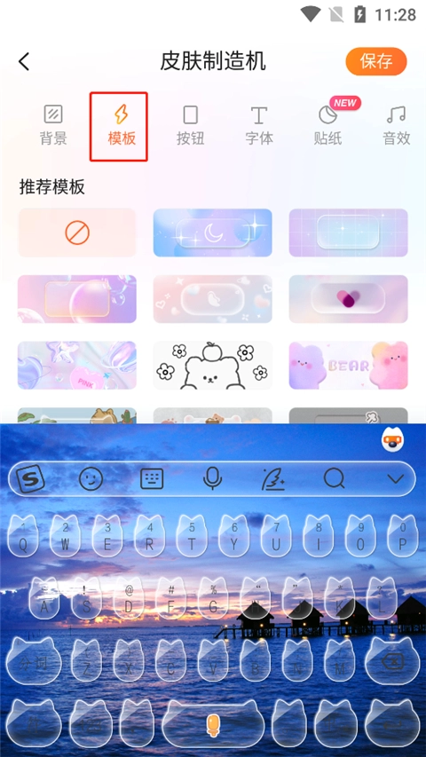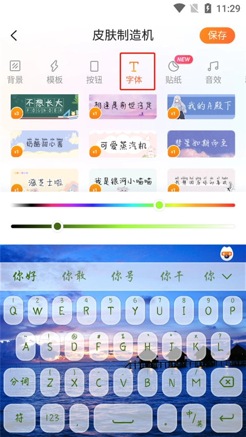 用户能够自定义键盘的背景、键位、按钮、字体、贴纸、音效、动态效果等各类元素,同时商城里还提供海量不同素材类型,足以满足不同用户对键盘皮肤的个性化需求。