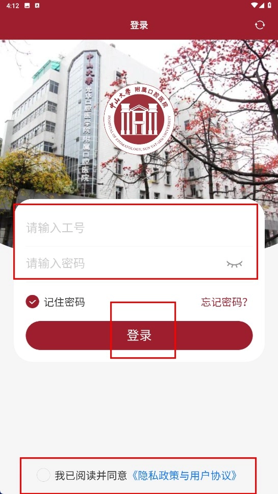 在登录界面,输入员工编号和密码,勾选同意隐私政策与用户协议后,点击【登录】按钮。