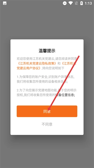 使用前请仔细阅读【江苏机关党建云隐私政策】及【江苏机关党建云用户协议】,在了解账户安全相关内容与位置信息收集说明后,点击【同意】按钮。