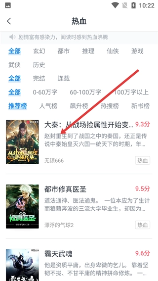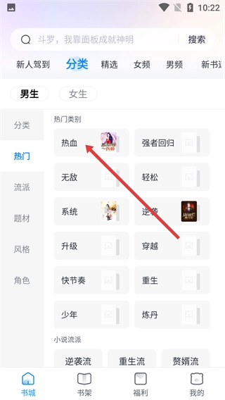 在分类页面,选择【热血】分类,该分类下设有多个热门标签,能够帮助读者精准筛选热血题材的小说。