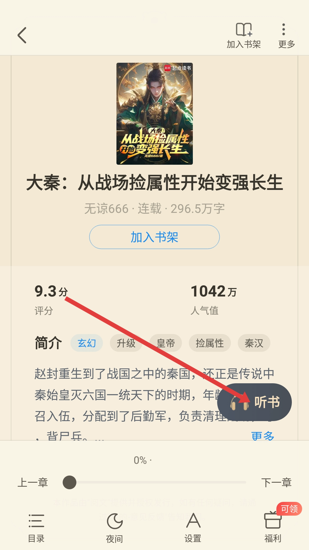 在热血分类列表里,挑选自己感兴趣的小说,比如《大秦:从战场捡属性开始变…》,点击后就能进入该小说的详情页面。