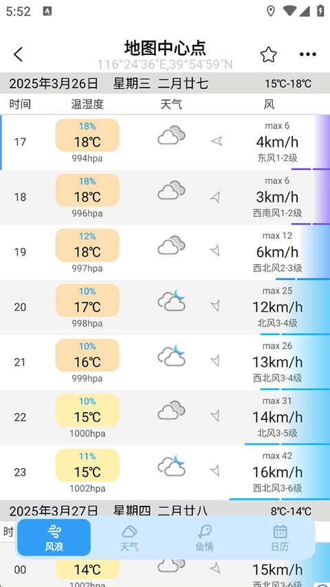 打开天气界面后,随意选择一个钓点点击,就能查看该地点的潮汐与天气情况,方便为钓鱼计划提供参考依据。