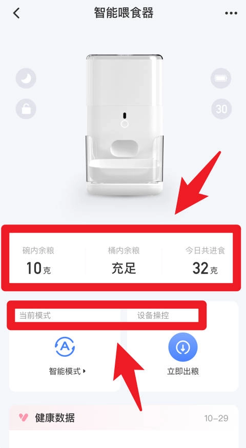 在智能喂食器的界面上,你能够查看碗内和桶里的剩余粮食,以及今天的总进食量,还可以选择智能模式或者直接进行立即出粮的操作。