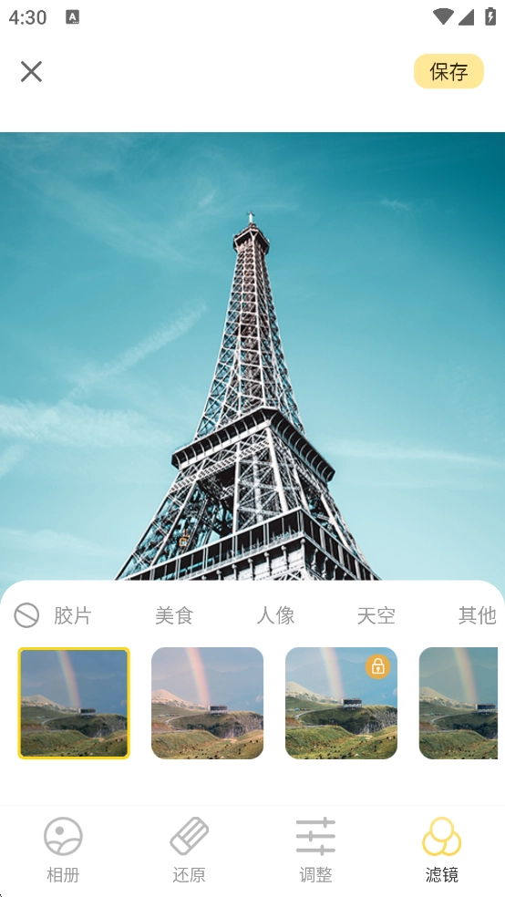 可以使用滤镜工具,从风景、人像、美食、天空、复古等不同主题里挑选合适的滤镜来使用。