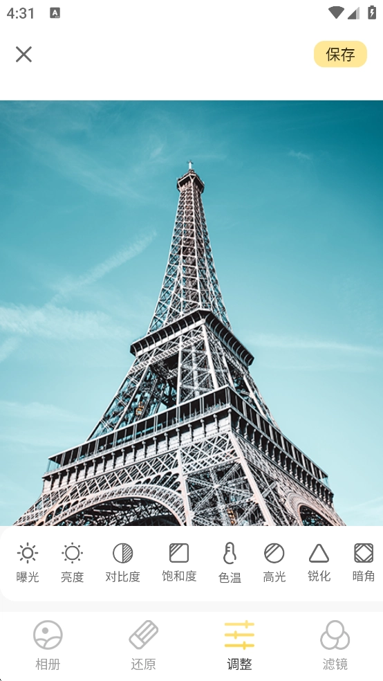 可以通过曝光、亮度、对比度、饱和度、锐化等进阶工具,来进行手动的精细调色。
