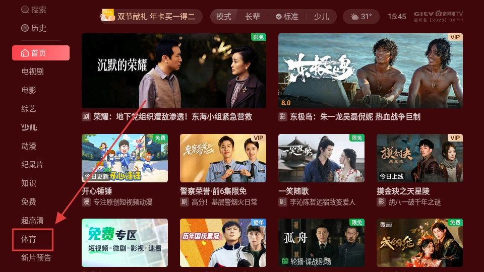 若您想观看体育赛事,只需在左侧导航栏找到【体育】选项并点击,即可进入体育频道。