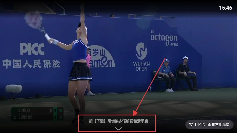进入赛事直播界面后,按下【下键】,即可切换多语解说并调整视频清晰度,从而优化您的观看体验。