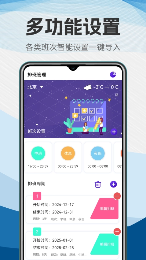 排班助手安卓最新版是一款功能强大且实用的办公服务类应用,借助它,用户能够轻松进行自定义排班,支持一键导入日历功能,还可设置智能备忘录,帮助用户及时了解待办事项,从而进一步提升办公效率!
