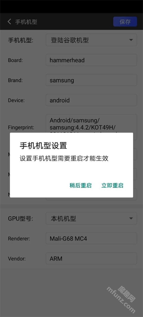 在“手机机型”选项里,挑选你心仪的虚拟机型,设置完成后点击“保存”按钮,接着选择“立即重启”选项。