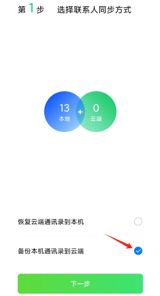 要是第一次进行备份操作,就选择“将本机通讯录备份到云端”这个选项,这样能保证所有联系人都被保存到云端服务器里。