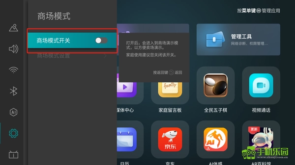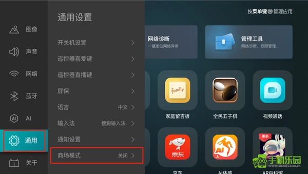 在通用设置里,找到商场模式并点击,把它的状态设置为“开启”。要是不开启这个模式的话,媒体中心当中就不会显示安装包文件。
