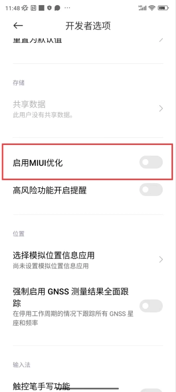 5、拉到底部,关闭“启用MIUI优化”后,重启手机 (注:关闭“启用MIUI优化”,必须重启手机!)