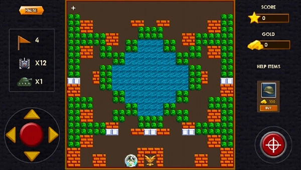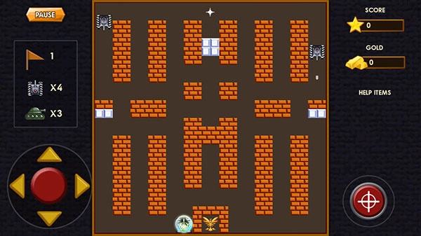 4、点击“PLAY”进入关卡,左下角可以上下左右控制己方坦克移动,右侧可以释放炮弹,左上角“PAUSE”还可以暂停游戏,在保护地形底部的司令部不被攻击的前提下再消灭敌方坦克,就可以过关。