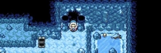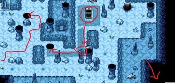 还是在第三层,最底下那个冰场一开始是没法通过的,得走右边的梯子,上去之后会看到一个箱子,把技能切换成“推”,按照图示把石头推下去,这样才能通过第三层的那个冰场。