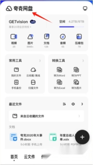点击夸克网盘页面后,会呈现出网盘空间信息以及GETvision功能,同时还包含常用工具与转换工具,借助这些工具能够对文件进行管理。