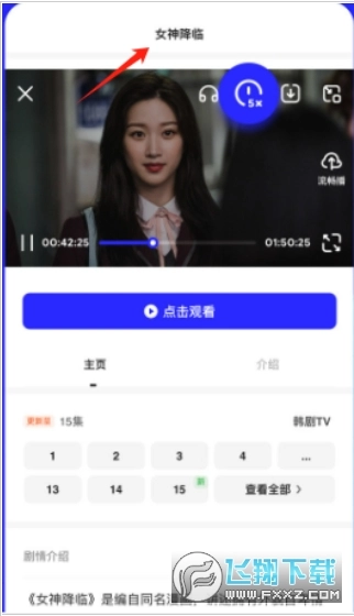 点击《女神降临》漫画的播放页面,即可查看播放进度、集数等信息,同时了解到该作品改编自同名漫画,并能浏览剧情概要。