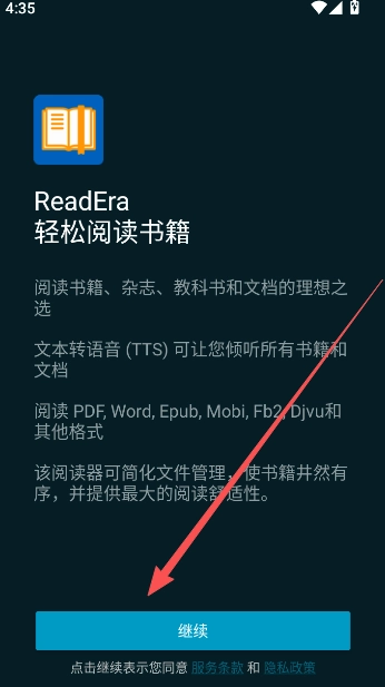 阅读软件开屏处的用户服务条款与隐私政策内容,点击继续按钮。