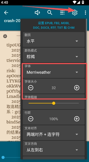 在ReadEra电子阅读器中修改字体,需先打开一份电子文档,然后在内容阅读详情界面点击上方的设置图标。