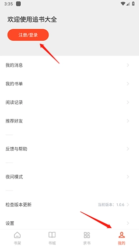 打开52追书大全,点击底部的“我的”按钮,接着点击“注册/登录”按钮。
