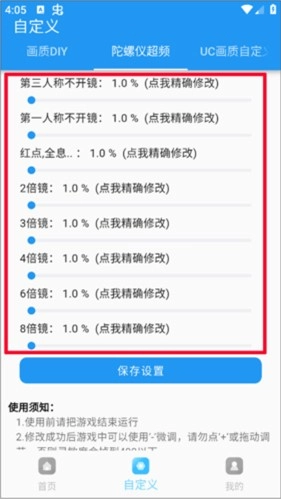 进入【自定义】选项后,你可以手动调整画质参数,比如画质DIY、陀螺仪超频、UC画质自定义等功能,以此来适配不同设备的需求。