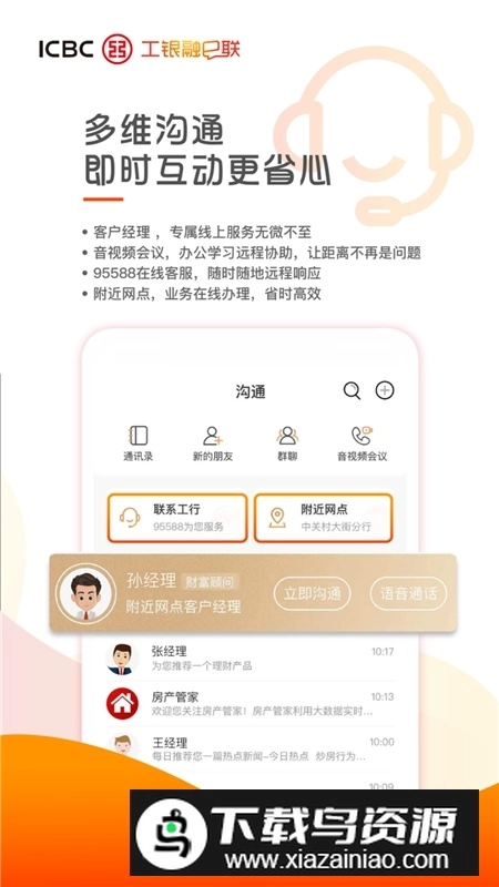 这是工商银行自主研发的移动金融客户端,用户可借助它与客户经理、在线客服及好友开展图文交流;该软件支持发布动态、办理转账、购买理财等各类操作,能满足信息沟通与业务办理的综合需求。