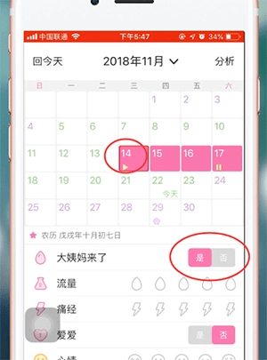 ・选择上次经期时间,在下方【大姨妈来了】选择【否】