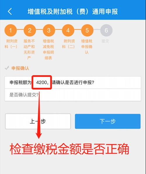 核对【增值税税额】栏次的金额,在确认该金额准确无误后,点击【下一步】按钮来完成申报提交操作。