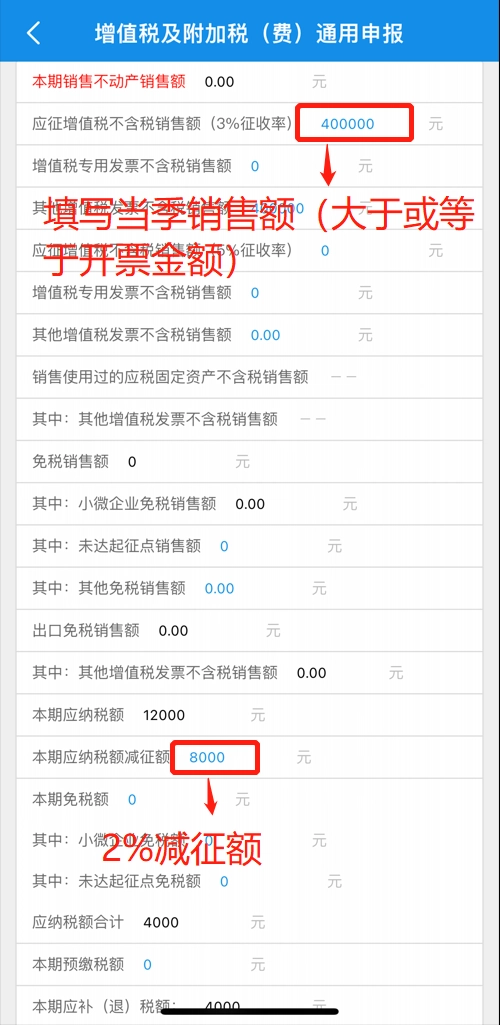 在【应征增值税不含税销售额(3%征收率)】这一栏,填写本季度的销售额(该销售额需大于或等于已开具发票的销售额);接着在【本期应纳税额减征额】栏中,填入对应的减征额金额。所有内容填写完毕后,点击页面下方的【确认】按钮即可。