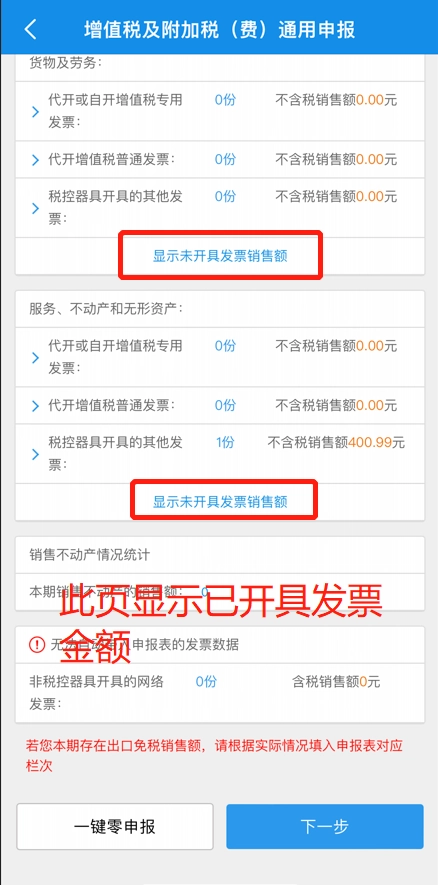 先核对当前页面所展示的已开具发票对应的销售额,在确认这些数据准确无误后,再点击界面上的【下一步】按钮。