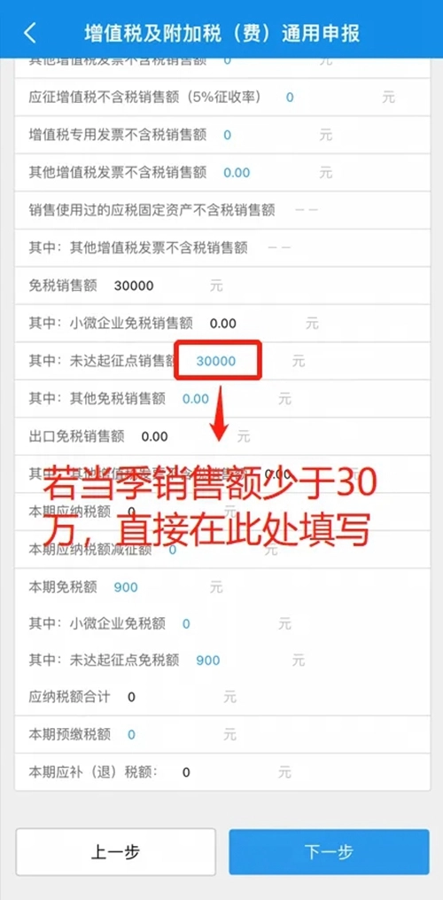 若本季度销售额不足30万元,可直接在【其中:未达起征点销售额】这一栏填写实际的销售金额,核对确认信息准确无误后,点击【下一步】按钮即可。