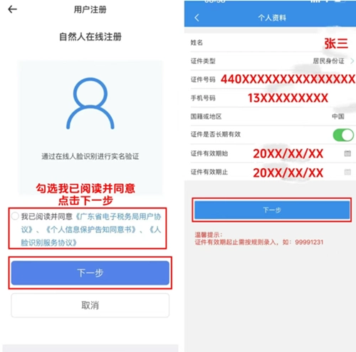 勾选“我已阅读并同意”后点击下一步,接着输入身份信息,再点击下一步。