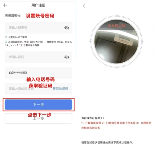 设置密码与常用电话号码,获取验证码后点击下一步,即可进入刷脸实名认证环节。