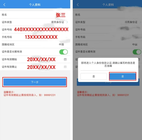 请先填写个人资料,完成填写并提交后,系统会提示您进行人脸识别。特别注意:填写信息时,证件有效期务必按照实际情况准确填写!!
