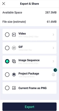 导出的文件格式包含视频(Video)、动态图(GIF)、Image Sequence(图像序列包)等类型。
