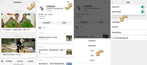 微信主页→搜索进入归蜜合作社或归农读书会→点击右上角→找到设置→选择添加到桌面