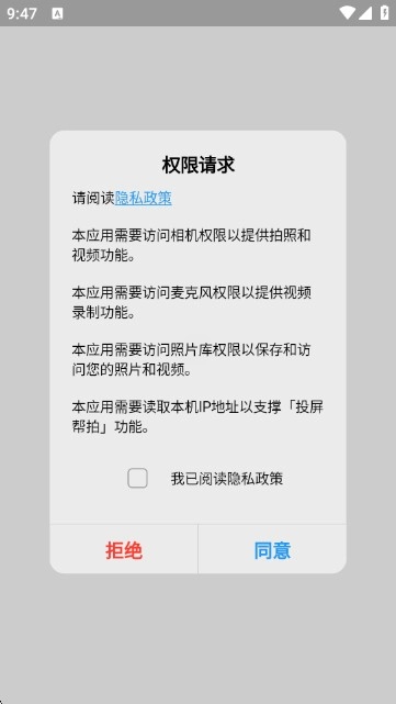 1:启动CamFusion应用,仔细阅读权限请求的相关说明,在勾选“我已阅读隐私政策”选项后点击“同意”按钮,完成相机、麦克风、照片库以及读取IP地址权限的授权操作,确保应用能够正常运行。