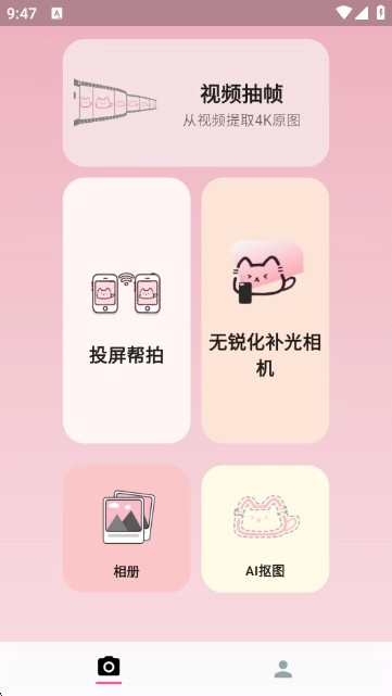 2:进入主界面后,能看到“视频抽帧”“投屏帮拍”“无锐化补光相机”“相册”“AI抠”等功能模块,大家可依据自身需求挑选对应的功能来开启使用。