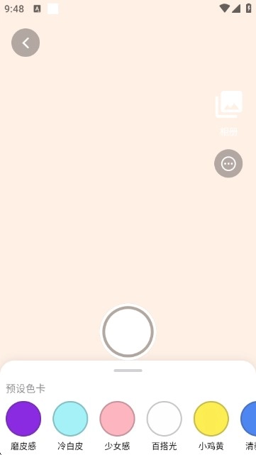 8:选择“无锐化补光相机”功能后,能挑选磨皮感、冷白皮、少女感等预设色卡来调整拍摄氛围,再点击拍摄按钮完成拍照。