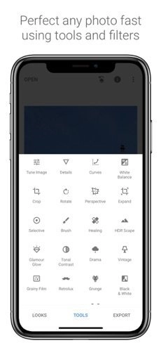 若要开始编辑操作,可点击工具选项卡。该选项卡会展示Snapseed的全部编辑工具。你可以通过水平滚动来浏览各个选项,之后点击相应选项即可完成选择。