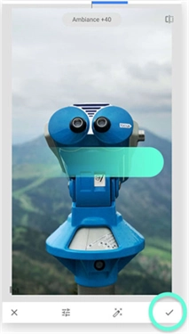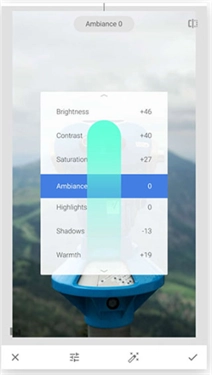 Snapseed 里的大部分调整功能都是如此运作的:在图像区域垂直滑动来挑选参数,接着水平滚动以调整参数的数值。