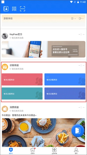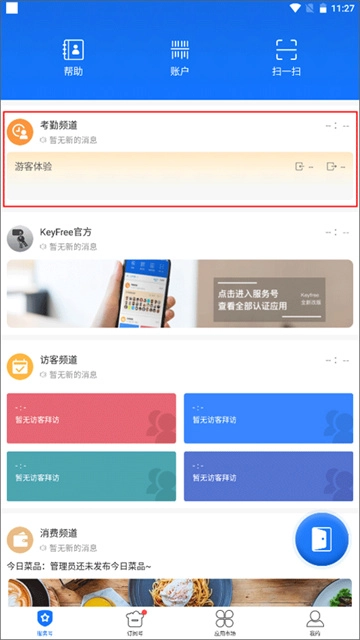 进入软件的【服务号】板块后,你会发现里面设有多个频道,像考勤频道、访客频道、消费频道之类的都包含在内,接下来点击进入考勤频道就可以了。