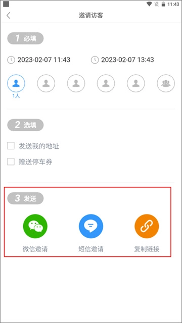 首先要设置好访问时间,接着选定需要拜访的对象,然后可根据情况选填发送自己的地址、赠送停车券,最后从三种邀请方式里挑选一种进行邀请,等邀请成功后,只需等待对方上门拜访即可。
