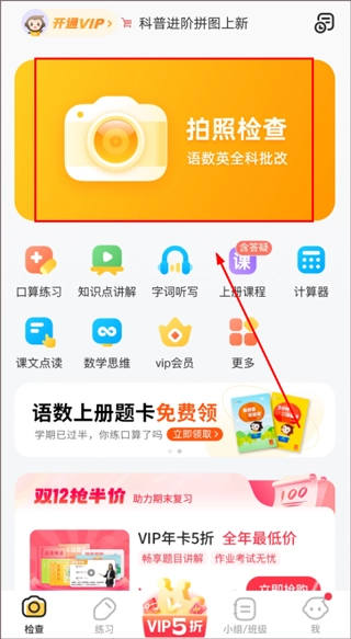 安装完小猿口算App后,把手机镜头对准习题册,点击“拍照检查”按钮,App就会自动识别练习册里的算术题,随即给出答案,习题的对错一眼就能看清楚。