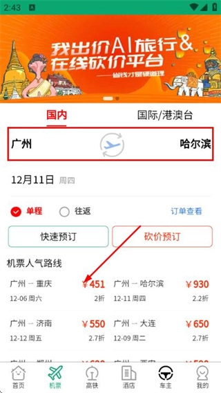 在机票预订页面选定出发城市与目的地城市后,点击对应的航线,即可进入航班列表页面。
