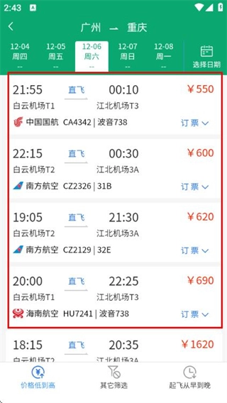 进入航班列表页面后,就能查看各个航班的时间、价格等相关信息了。