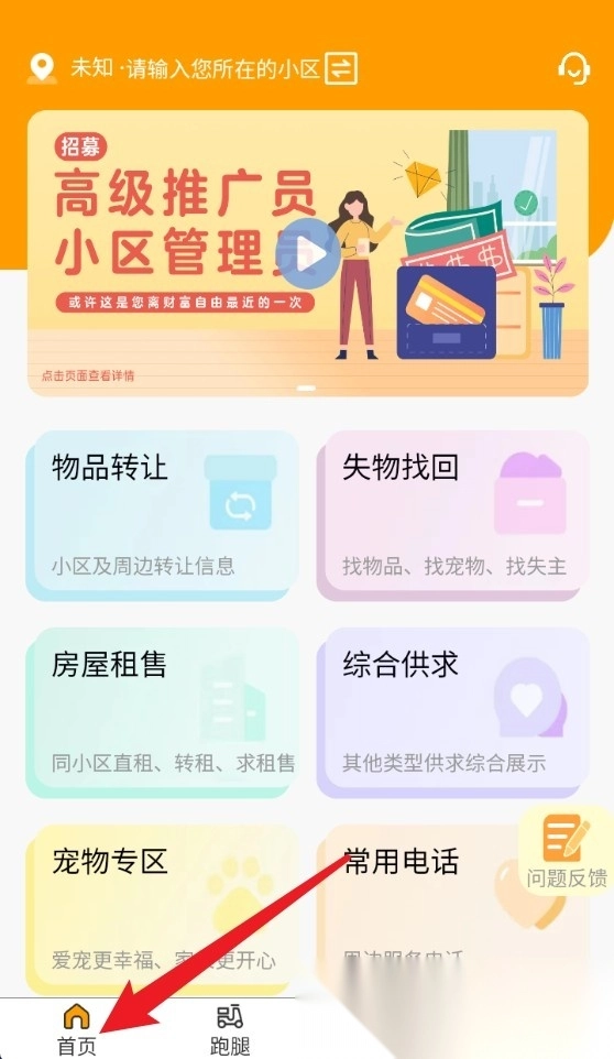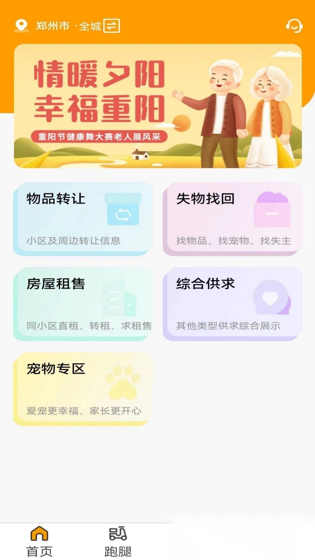 登录后默认进入首页,可选择物品转让、失物找回、房屋租售等常用便民功能;