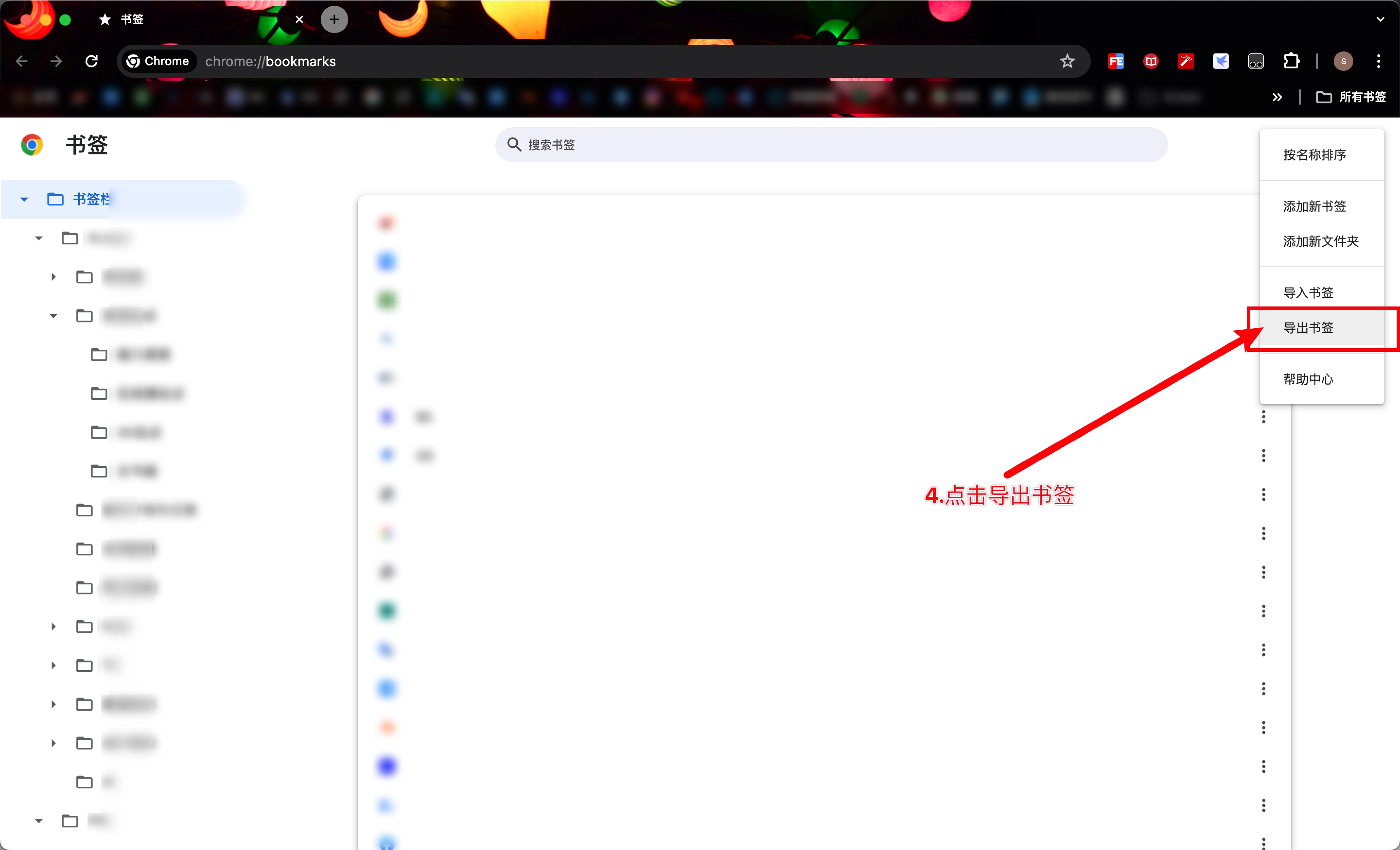点击地址栏右侧的三个点(「更多」选项),然后依次选择「书签和清单」、「显示所有书签」