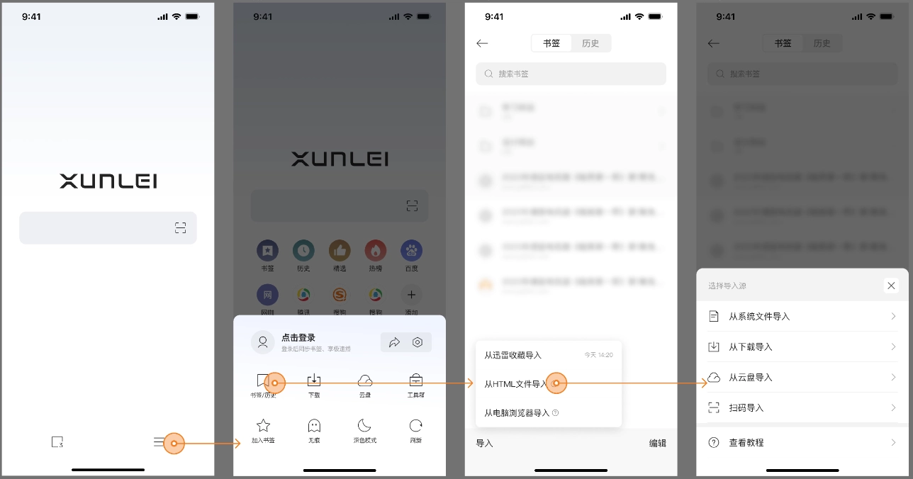 ① 打开迅雷浏览器,通过“导入电脑书签”功能生成书签html二维码;接着把导出的书签.html文件上传至网页生成二维码,最后使用迅雷浏览器扫码(Android版本需≥1.0.7、iOS版本需≥1.6.0)即可完成操作。