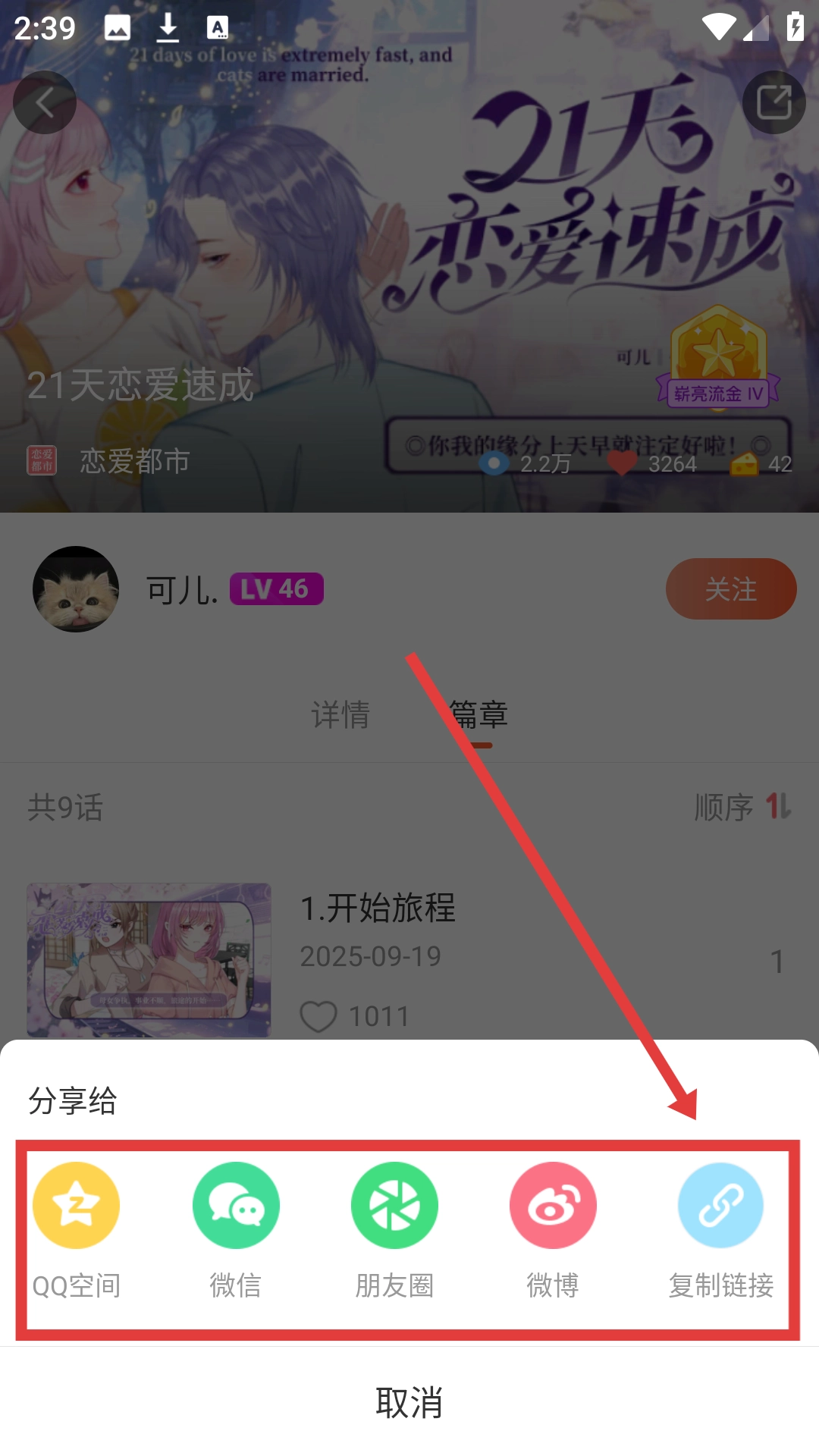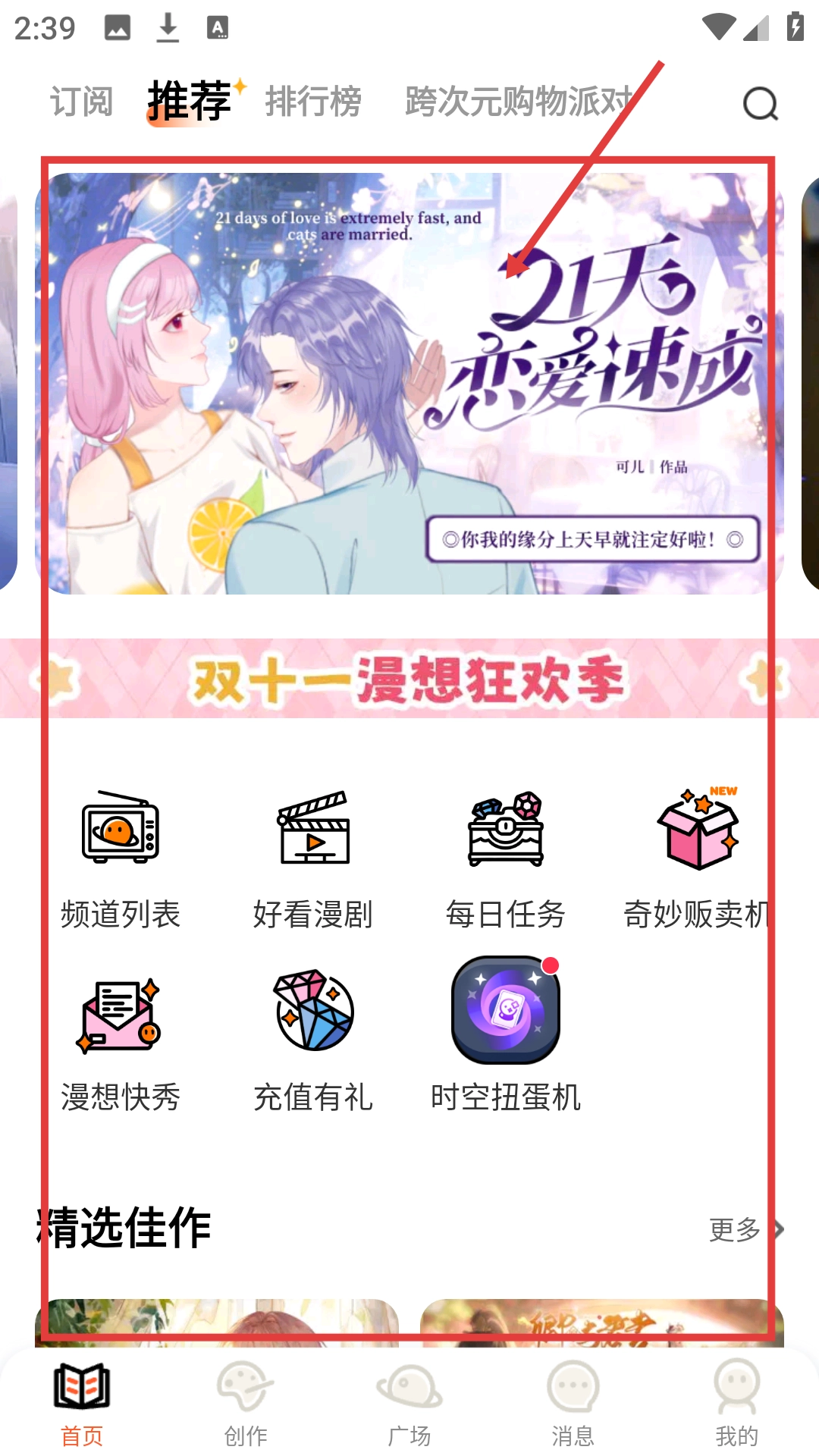 在软件首页的推荐区域,点击《21天恋爱速成》的封面图,就能进入这部作品的详情页面了。